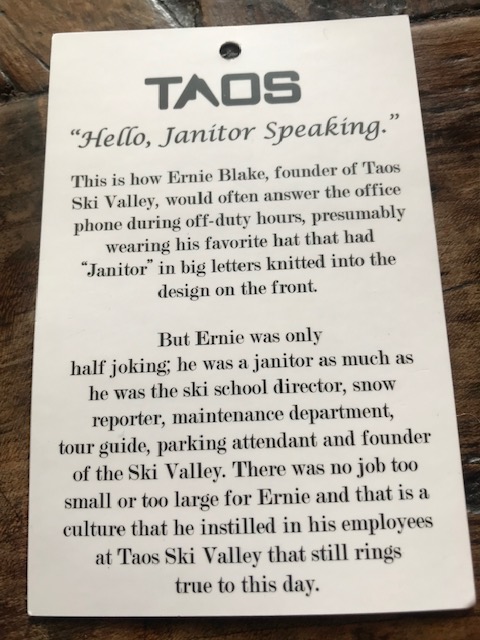 Last week my teenage son was at a ski competition at Taos Ski Valley and he brought home a ski hat with “Janitor” across the front. While the hat was nice, I was really curious about why it said “Janitor.” My son shared that the founder of Taos Ski Valley, Ernie Blake, used to wear a similar hat with “Janitor” emblazoned on it to emphasizes the importance of helping out wherever necessary. The tag on the hat explained how Ernie saw his role: